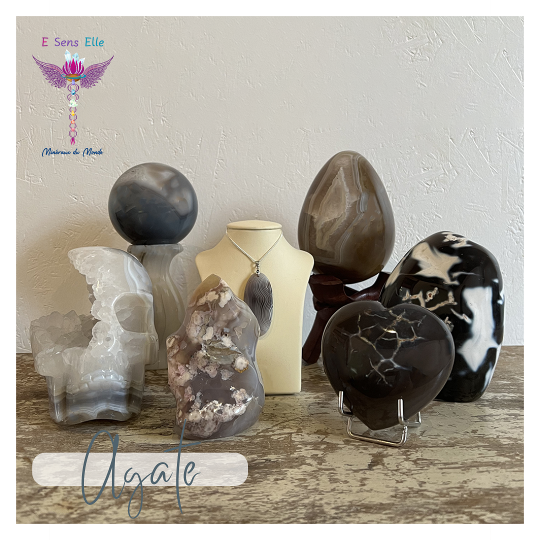 Chaque agate est unique : ses dessins, ses inclusions et ses couleurs varient considérablement, ce qui en fait une pierre à la fois accessible et profondément singulière.